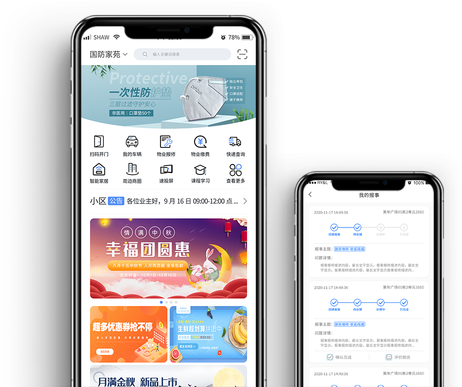 智慧社區(qū)生活平臺是連接物業(yè)、 居民、商家、便民資源于一體的聚合服務(wù)平臺, 以物業(yè)管理、硬件整合、社區(qū)O2O、鄰里社交、 公共服務(wù)等5大維度;APP+小程序+微信公眾號 +PC端4類終端深入各類應(yīng)用場景,打造智慧社區(qū)生活。